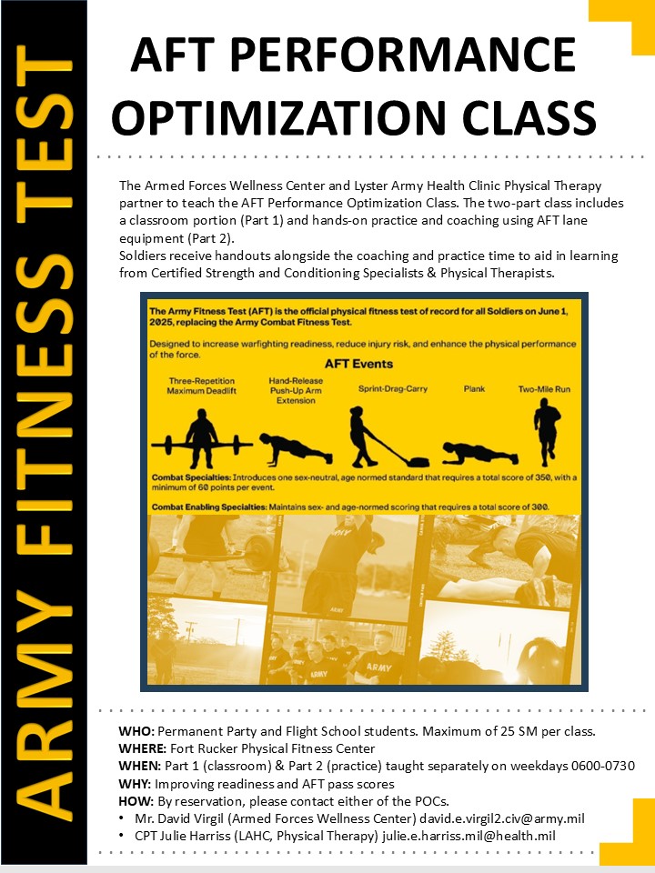 The Army Wellness Center and Lyster Army Health Clinic Physical Therapy are partnering to teach the AFT Performance Optimization Class. The two-part class includes a classroom portion (Part 1) and hands-on practice and coaching using AFT lane equipment (Part 2). Soldiers will receive handouts alongside the coaching and practice time to aid in learning from Certified Strength and Conditioning Specialists & Physical Therapist.